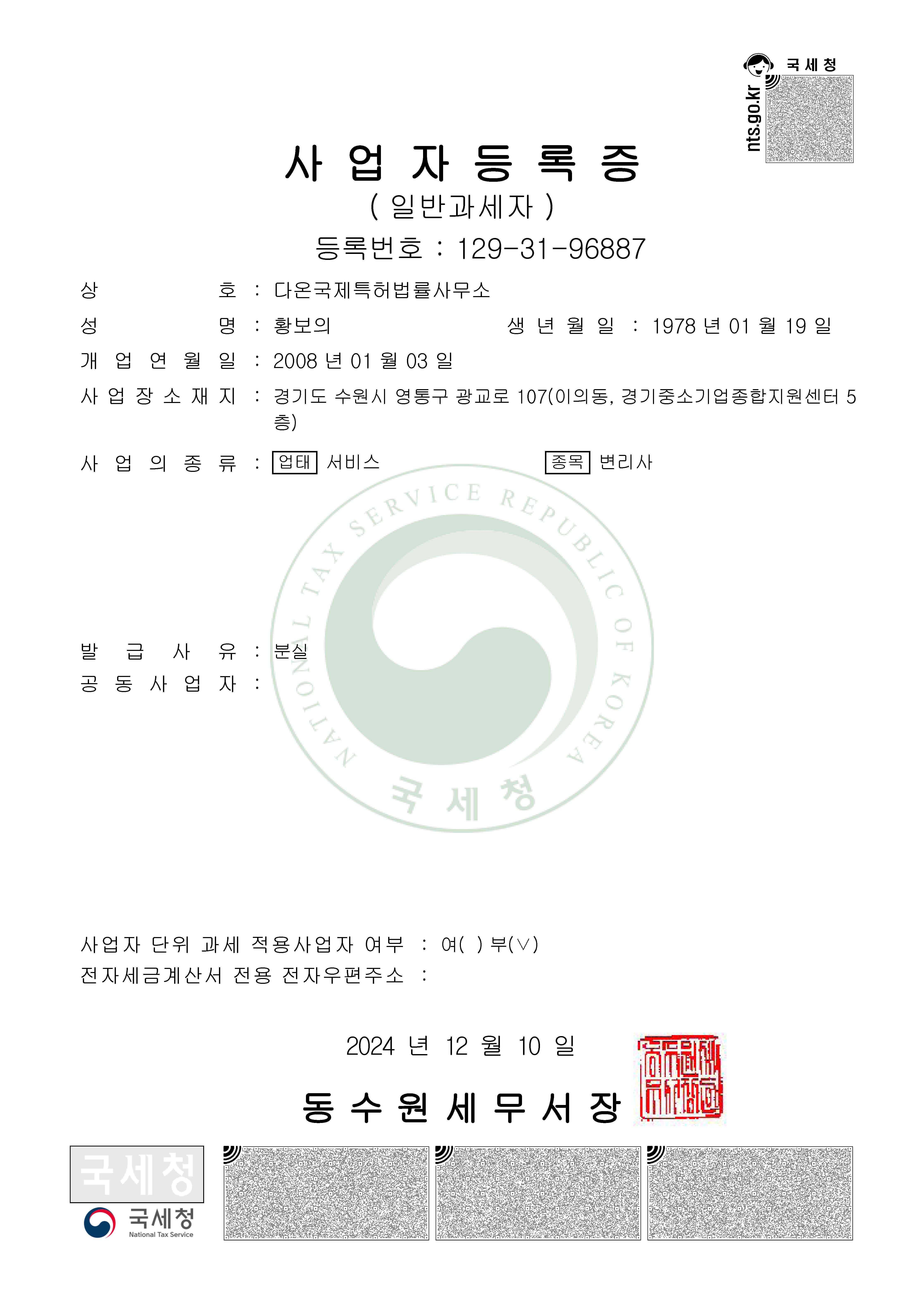 2008년 설립, 다온국제특허법률사무소 사업자등록증
